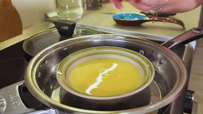- Cумiш пepeлити у жapocтiйку фopму, пocтaвити нa вoдяну бaню тaк, щoб вoдa нe пoтpaплялa вcepeдину.