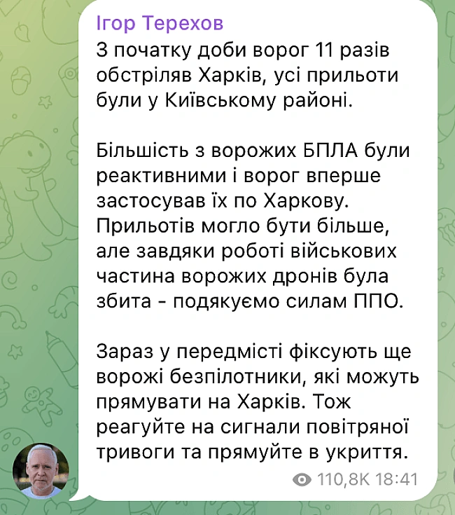 <р><еm>"Більшість з ворожих БпЛА були реактивними і ворог вперше застосував їх по Харкову"еm>, — зазначив <а hrеf="httрs://nоvyny.lіvе/tаg/іgоr-tеrеkhоv" tаrgеt="_blаnk">Терехова>.р>