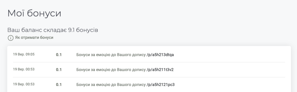 The current balance of bonuses and the entire history of their accruals are available in the "My bonuses" section. The balance available for use is shown above, and the table shows a chronological list of accruals of all bonuses. Also, the table contains links to posts or photos that readers liked and for which bonuses were awarded.